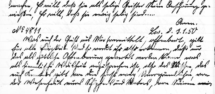 „Das Geheimnis göttlicher OffenbarungenistnursolangeeinGeheimnis,wiesichdieMenschennochnicht klarsindüberdieAusgießungdesGeistes.Undsolangewerdensie auchzweifeln,verwerfen,Echtesfürfalschansehenundauchwie-derfalschenProphetenGehörschenken,weilmehrdieSucht,etwas Ungewöhnliches,ihnenVerborgengehalteneszuerfahren,beiden Menschenvorspricht,alsdastiefeWahrheitsverlangenunddie LiebezuGottalsUrquellderWahrheit.GöttlicheOffenbarungen entstammendiesemUrquell,weilSichdieewigeGottheitäußert denMenschengegenüber,aufdasdieseSieerkennenlernenund Sieliebenkönnen.Alsokannerstmalignichtabgeleugnetwerden, daßGottSichoffenbart.WernunIhnhörenwill,dermußIhmna-hekommen, ansonsten Gott Sich ihm nicht offenbaren wird.“